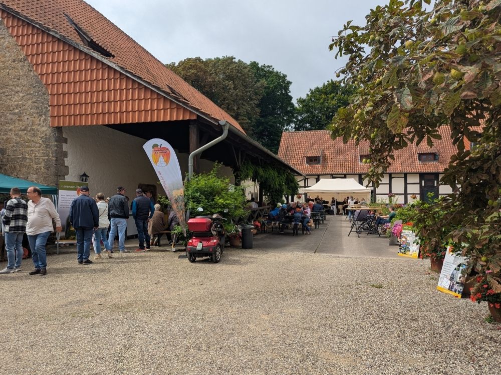 Im Rahmen eines über und über blühenden Schlosshofes (für den sich alljährlich die Hausherrin Gabriele von Münchhausen verantwortlich zeigt) neigte sich der Frühschoppen am späten Nachmittag dem Ende zu. Nachdem sich doch noch sommerliche Temperaturen durchgesetzt hatten, bedankten sich viele Gäste beim Nachhausegang für eine gelungene Veranstaltung, die sicherlich wiederholt wird.